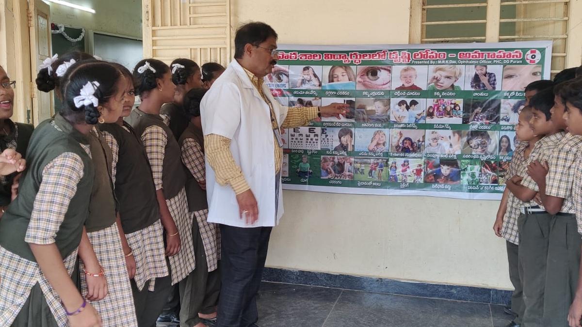 Ophthalmic officer M.R.K. Das creating awareness on protection of eyes at a medical camp organised in Srikakulam on Tuesday. |…