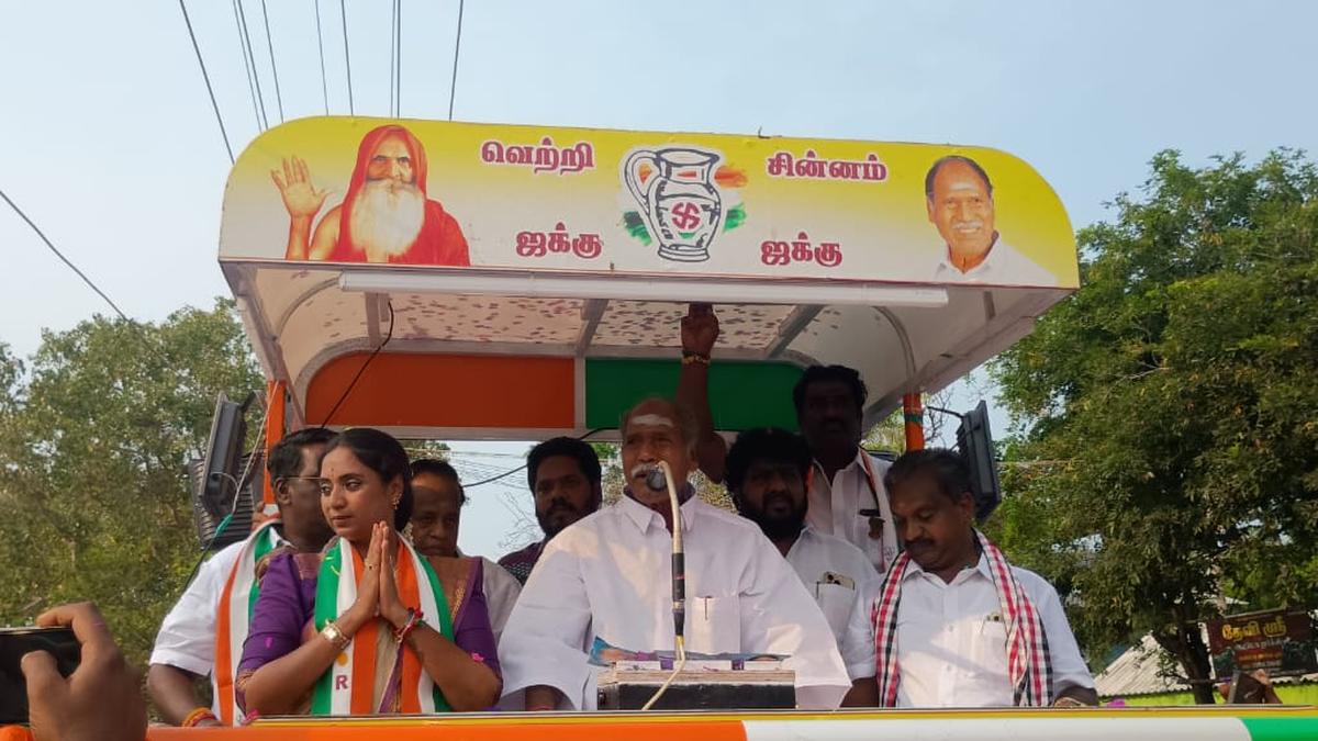 Puducherry Chief Minister N. Rangasamy campaigning in an open jeep for AINRC candidate Chandira Priyanga in the Poovam area of…