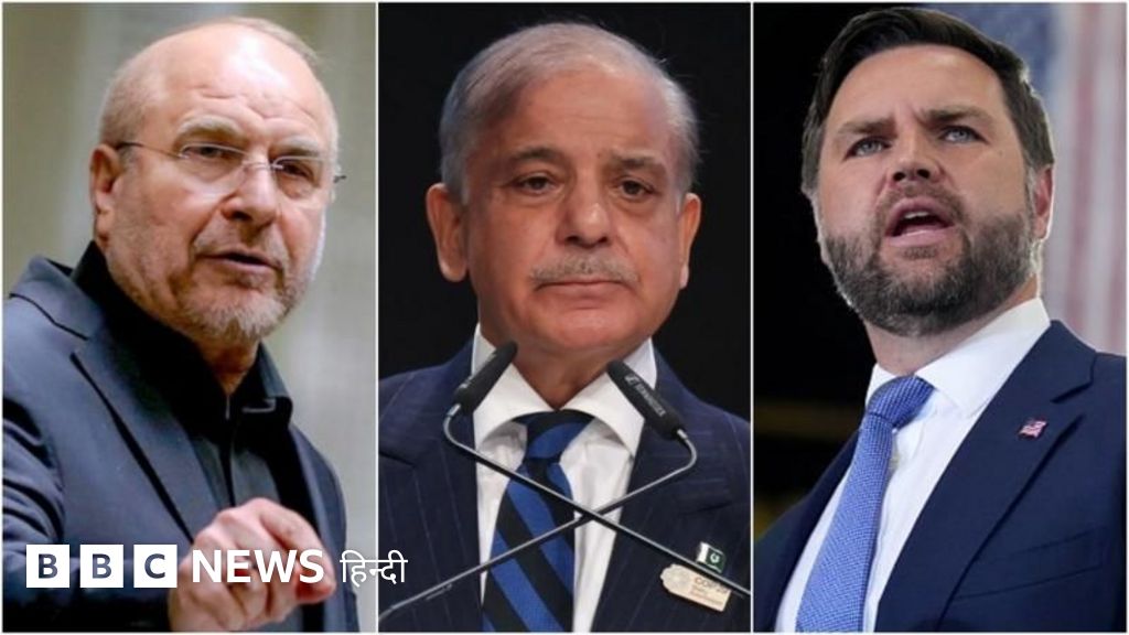 इमेज कैप्शन, ईरानी संसद के स्पीकर मोहम्मद बाक़र क़ालीबाफ़ (बाएं) और अमेरिका के उपराष्ट्रपति जेडी वेंस (दाएं) ने बैठक से पहले पाकिस्तान के प्रधानमंत्री शहबाज़ शरीफ़ (बीच में) से मुलाक़ात की है