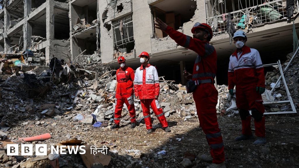 इमेज कैप्शन, ईरान की राजधानी तेहरान में हवाई हमले से क्षतिग्रस्त एक इमारत में रेड क्रॉस बचाव दल के सदस्य ….में