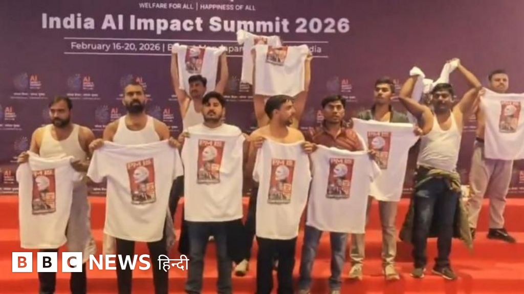 राजधानी दिल्ली में चल रहे एआई इम्पैक्ट समिट में शुक्रवार को यूथ कांग्रेस के कार्यकर्ता टी-शर्ट उतारकर पहुंचे थे और प्रधानमंत्री नरेंद्र मोदी के ख़िलाफ़ नारेबाज़ी की थी.