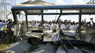 तेलंगाना बस हादसे के बाद टूटी पड़ी बस और बिखरी गिट्टी। फोटो- एएनआई