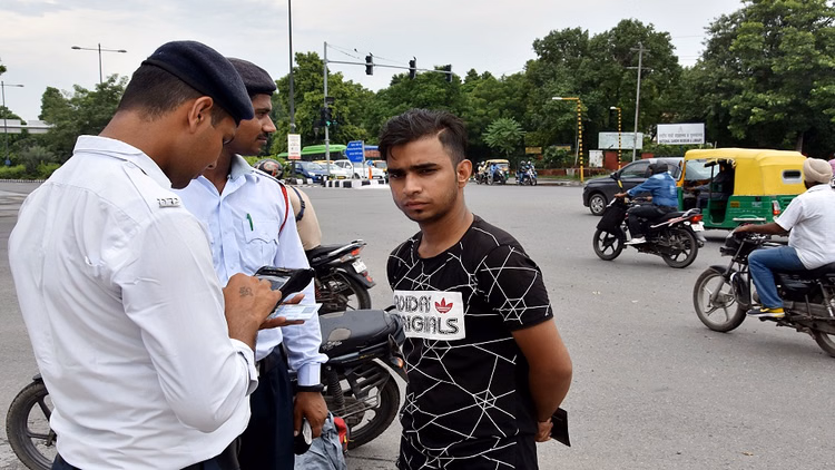 पीयूसी जांच करते दिल्ली ट्रैफिक पुलिस कर्मी