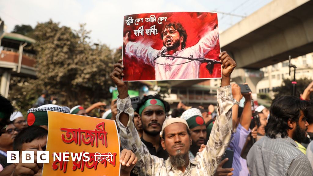 इमेज कैप्शन, ढाका में 19 दिसंबर 2025 को शरीफ उस्मान हादी की मृत्यु के बाद हुए विरोध प्रदर्शन में एक प्रदर्शनकारी उनकी तस्वीर पकड़े हुए है.