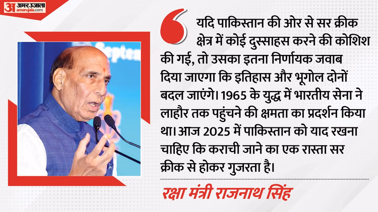 उन्होंने कहा कि भारतीय सेना और बीएसएफ संयुक्त रूप से और सतर्कतापूर्वक भारत की सीमाओं की रक्षा कर रहे हैं। यदि पाकिस्तान की ओर से सर क्रीक क्षेत्र में कोई दुस्साहस करने की कोशिश की गई, तो उसका इतना निर्णायक जवाब दिया जाएगा कि इतिहास और भूगोल दोनों बदल जाएंगे। 1965 के युद्ध में भारतीय सेना ने लाहौर तक पहुंचने की क्षमता का प्रदर्शन किया था। आज 2025 में पाकिस्तान को याद रखना चाहिए कि कराची जाने का एक रास्ता सर क्रीक से होकर गुजरता है।
