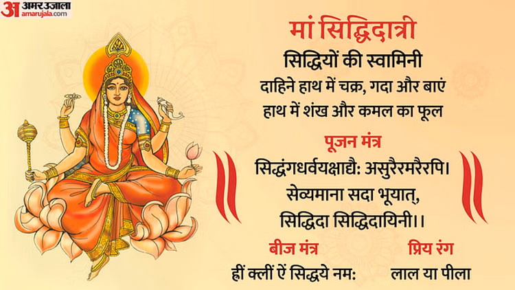 नवरात्रि के नौवें दिन मां दुर्गा के नवें स्वरूप सिद्धिदात्री की उपासना की जाती है। देवी का यह रूप समस्त सिद्धियों को प्रदान करने वाला है। मार्कण्डेय पुराण के अनुसार अणिमा, महिमा, गरिमा, लघिमा, प्राप्ति, प्राकाम्य, ईशित्व और वशित्व-ये आठ सिद्धियां मां सिद्धिदात्री से ही प्राप्त होती हैं।
