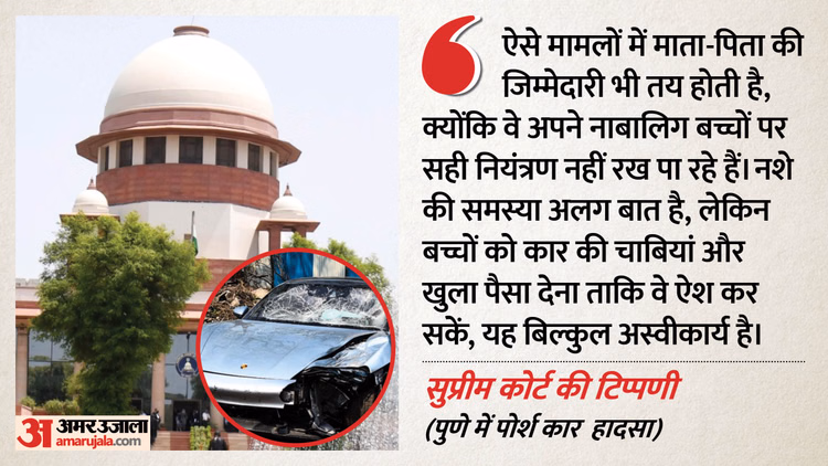 सुप्रीम कोर्ट ने 2024 के चर्चित पुणे पोर्श कार हादसा मामले में तीन आरोपियों को जमानत दे दी है। इस हादसे में दो आईटी पेशेवरों की मौत हो गई थी। कोर्ट ने इस दौरान अहम टिप्पणी करते हुए कहा कि ऐसे मामलों में माता-पिता की जिम्मेदारी भी तय होती है, क्योंकि वे अपने नाबालिग बच्चों पर सही नियंत्रण नहीं रख पा रहे हैं।