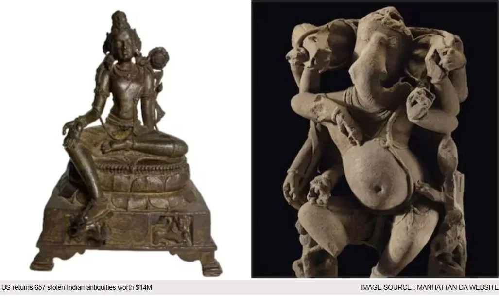 – മധ്യപ്രദേശിലെ ഒരു ക്ഷേത്രത്തിൽ നിന്ന് കൊള്ളയടിച്ച ഗണേശന്റെ ഒരു മണൽക്കല്ല് പ്രതിമ അതിലൊന്നാണ്. പിന്നീട് അന്താരാഷ്ട്ര ചാനലുകൾ വഴി ഇത് വിൽക്കുകയായിരുന്നു.