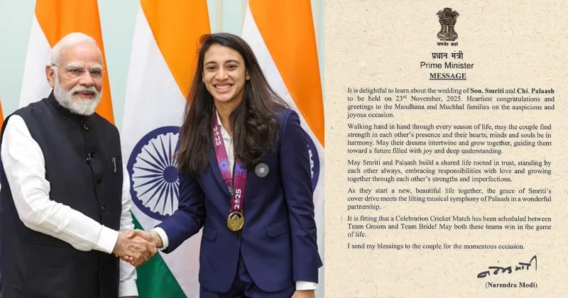 “2025 നവംബർ 23 ന് നടക്കാനിരിക്കുന്ന സ്മൃതിയുടെയും പലാഷിന്റെയും വിവാഹത്തെക്കുറിച്ച് അറിയുന്നത് സന്തോഷകരമാണ്. ഈ ശുഭകരവും സന്തോഷകരവുമായ അവസരത്തിൽ മന്ദാന, മുച്ചാൽ കുടുംബങ്ങൾക്ക് ഹൃദയംഗമമായ അഭിനന്ദനങ്ങളും ആശംസകളും” എന്ന് കത്തിൽ പറയുന്നു. “ജീവിതത്തിലെ ഓരോ കാലഘട്ടത്തിലും കൈകോർത്ത് നടക്കുമ്പോൾ, ദമ്പതികൾ പരസ്പരം സാന്നിധ്യത്തിൽ ശക്തി കണ്ടെത്തട്ടെ, അവരുടെ ഹൃദയങ്ങളും മനസ്സുകളും ആത്മാക്കളും ഐക്യത്തിലായിരിക്കട്ടെ. അവരുടെ സ്വപ്നങ്ങൾ ഇഴചേർന്ന് വളരട്ടെ, സന്തോഷവും ആഴത്തിലുള്ള ധാരണയും നിറഞ്ഞ ഒരു ഭാവിയിലേക്ക് അവരെ നയിക്കട്ടെ,” മോദി കൂട്ടിച്ചേർത്തു.