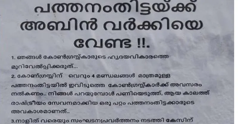 കോണ്ഗ്രസുകാരുടെ ഹൃദയവികാരത്തെ മുറിവേല്പ്പിക്കരുതെന്ന് പോസ്റ്ററില് പറയുന്നു.നാല് മണ്ഡലങ്ങള് മാത്രം കോണ്ഗ്രസിന് ഉളള പത്തനംതിട്ടയില് ജില്ലയിലുള്ള കോണ്ഗ്രസുകാര്ക്ക് അവസരം നല്കണം. സാധാരണക്കാരായ അണികളുടെ ആത്മാഭിമാനത്തെ പണയം വച്ച് കൊടുക്കരുത് നേതാക്കളെ എന്നും പോസ്റ്ററില് എഴുതിയിട്ടുണ്ട്.ആറന്മുളയില് അബിന് വര്ക്കിയെ പരിഗണിക്കുന്നത് ഉറപ്പായതോടെയാണ് പോസ്റ്റര് പ്രത്യക്ഷപ്പെട്ടത്.