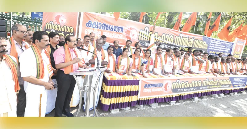 ഇന്നലെ രാവിലെ 10 മുതല് വൈകിട്ട് 5 വരെ നടന്ന പ്രതിഷേധത്തില് സംസ്ഥാന പ്രസിഡന്റ് ജെ. മഹാദേവന് അധ്യക്ഷനായി. സംസ്ഥാന ജനറല് സെക്രട്ടറി എസ്. രാജേഷ്, ഫെറ്റോ സംസ്ഥാന ട്രഷറര് സി. കെ. ജയപ്രസാദ്, കേരള സ്റ്റേറ്റ് പെന്ഷനേഴ്സ് സംഘ് സംസ്ഥാന ജനറല് സെക്രട്ടറി ബി. ജയപ്രകാശ്, കേരള ഗസറ്റഡ് ഓഫീസേഴ്സ് സംഘ് സംസ്ഥാന ജനറല് സെക്രട്ടറി ടി.എന്. രമേശ്, കേരള സെക്രട്ടേറിയറ്റ് എംപ്ലോയീസ് സംഘ് സംസ്ഥാന പ്രസിഡന്റ് റ്റി. ഐ. അജയകുമാര്, എന്ജിഒ സംഘ് സംസ്ഥാന ഭാരവാഹികളായ അനിത രവീന്ദ്രന്, പ്രദീപ് പുള്ളിത്തല, എസ്. വിനോദ്കുമാര്, പി. ആര്യ, എന്.വി. ശ്രീകല എന്നിവര് സംസാരിച്ചു. ബിഎംഎസ് സംസ്ഥാന സമിതി അംഗം ജയകുമാര് നാരങ്ങാനീര് നല്കി സമരം അവസാനിപ്പിച്ചു.