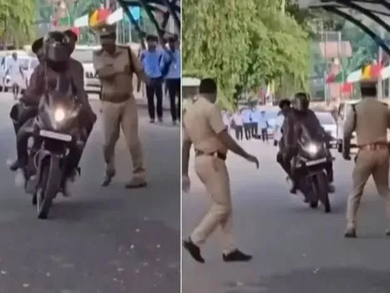 പാലാ ജനറല് ആശുപത്രി ജങ്ഷനും മുത്തോലിക്കും ഇടയിലായിരുന്നു സംഭവം. ബൈക്ക് ഓടിച്ചിരുന്നയാള്ക്ക് മാത്രമാണ് ഹെല്മെറ്റ് ഉണ്ടായിരുന്നത്. കെ.എല് 06 ജെ 6920 എന്ന നമ്പറിലുള്ള ബൈക്കിലാണ് യുവാക്കള് യാത്ര ചെയ്തിരുന്നത്. പൊലീസ് ഉദ്യോഗസ്ഥര് തടയാന് ശ്രമിച്ചെങ്കിലും യുവാക്കള് വെട്ടിച്ച് കടന്നുപോയതായി ദൃശ്യങ്ങളില് കാണാം.