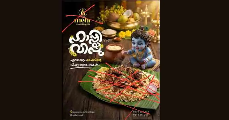 കോഴിക്കോട്: ചേർത്തലയിലെ മെഹർ ഹോട്ടൽ ആൻഡ് ഗ്രിൽസ് പുറത്തിറക്കിയ വിഷു ആശംസാ പോസ്റ്ററിൽ ഭാരതത്തിലെ ഹിന്ദുക്കളുടെയും ഹൃദയവികാരമായ ശ്രീകൃഷ്ണനെ അവഹേളിക്കുകയും അപമാനിക്കുകയും ചെയ്തതിൽ ശക്തമായ പ്രതിഷേധവുമായി കേരള ക്ഷേത്ര സംരക്ഷണ സമിതി.