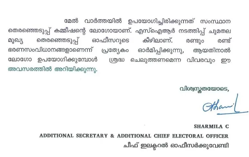എന്നാൽ മീഡിയാ വൺ ചാനൽ, അവരുടെ വാർത്തിൽ കണ്ണടച്ചുനടത്തിയ വിമർശനത്തിലെ വലിയ പിഴവ് കമ്മീഷൻ ചൂണ്ടിക്കാണിക്കുന്നതിങ്ങനെ: ”മേൽ വാർത്തയിൽ ഉപയോഗിച്ചിരിക്കുന്നത് സംസ്ഥാനതെരഞ്ഞെടുപ്പുകമ്മീഷന്റെ ലോഗോയാണ്. എസ്ഐആർ നടത്തിപ്പു ചുമതല മുഖ്യ തെരഞ്ഞെടുപ്പ് ഓഫീസറുടെ കീഴിലാണ്. രണ്ടും രണ്ട് ഭരണ സംവിധാനങ്ങളാണെന്ന് പ്രത്യേകം ഓർമ്മിപ്പിക്കുന്നു. ആയതിനാൽ ലോഗോ ഉപയോഗിക്കുമ്പോൾ ശ്രദ്ധ ചെലുത്തണമെന്ന വിവരരും ഈ അവസരത്തിൽ അറിയിക്കുന്നു.”