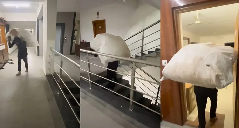 വീഡിയോയിൽ ഒരു ഡെലിവറി ബോയ് തന്നേക്കാൾ വലിയ ഒരു പാഴ്സൽ ചുമന്ന് പടികൾ കയറുന്നത് കാണാം. ഹൗസിംഗ് സൊസൈറ്റിയിലെ ലിഫ്റ്റ് ഉപയോഗിക്കാൻ അദ്ദേഹത്തെ അനുവദിക്കാതിരുന്നതാണ് ഈ ദുരവസ്ഥയ്ക്ക് കാരണമായതെന്നാണ് റിപ്പോർട്ടുകൾ സൂചിപ്പിക്കുന്നത്. ആറ് നിലകളാണ് ഇത്തരത്തിൽ ഭാരമേറിയ പാഴ്സലുമായി അദ്ദേഹത്തിന് നടന്ന് കയറേണ്ടി വന്നത്.@Abhishekkkk10 എന്നയാൾ പങ്കുവച്ച വീഡിയോയിൽ ഡെലിവറി ഏജൻ്റ് നടക്കുന്നതിനിടയിൽ അയാളുടെ ബാലൻസ് നഷ്ടപ്പെടുന്നത് കാണാം.