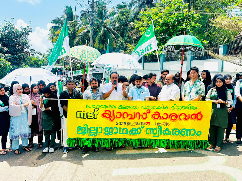 സമരോൽസുക വിദ്യാർത്ഥിത്വം’ എന്ന പ്രമേയത്തിൽ എം.എസ്.എഫ് മലപ്പുറം ജില്ലാ കമ്മിറ്റി സംഘടിപ്പിക്കുന്ന ‘ക്യാമ്പസ് കാരവൻ’ അഞ്ചു നാൾ പിന്നിട്ടു. ഒക്ടോബർ 7 വരെയാണ് ജില്ലയിലെ വിവിധ ക്യാമ്പസുകളിൽ പര്യടനം നടത്തുന്നത്.