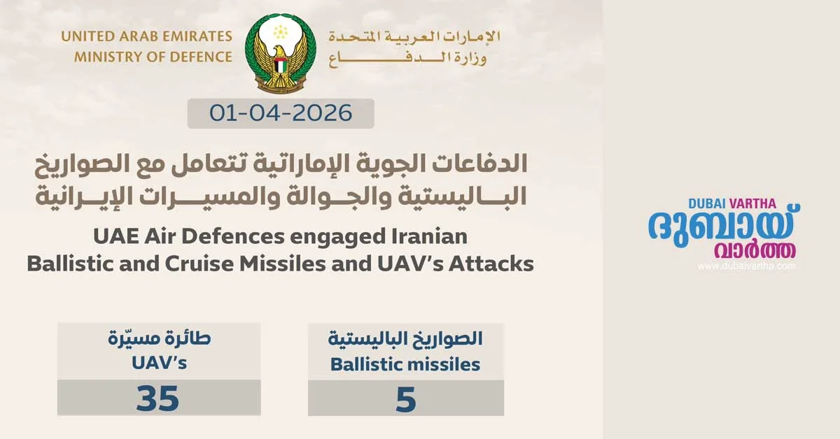 ഇറാനിൽ നിന്നും ഇന്ന് വന്ന 5 ബാലിസ്റ്റിക് മിസൈലുകളും, 35 യുഎവികളും നിർവീര്യമാക്കിയതായി യുഎഇ : ഇന്ന് ഒരു മരണം കൂടി – Dubai Vartha Skip to content error: Content is protected !! Related Post navigation ഉമ്മുൽ ഖുവൈനിൽ ഡ്രോൺ അവശിഷ്ടങ്ങൾ പതിച്ച് ഒരു ഇന്ത്യൻ പൗരന് പരിക്ക്യുഎൻ സെക്രട്ടറി ജനറലുമായി കൂടിക്കാഴ്ച നടത്തി ബഹ്റൈൻ വിദേശകാര്യ മന്ത്രി; മേഖലയിലെ സുരക്ഷാ വെല്ലുവിളികൾ ചർച്ച ചെയ്തു