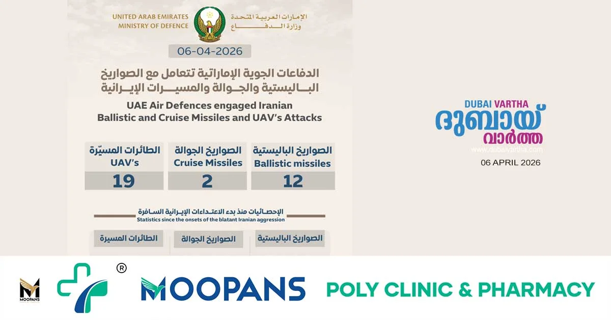 ഇറാനിൽ നിന്ന് ഇന്ന് വന്ന 12 ബാലിസ്റ്റിക് മിസൈലുകളും, 2 ക്രൂയിസ് മൈസൈലുകളും 19 യുഎവികളും നിർവീര്യമാക്കിയതായി യുഎഇ ! – Dubai Vartha Skip to content error: Content is protected !! Related Post navigation 10 ലക്ഷത്തിലധികം കണ്ടെയ്നറുകൾ; ചെങ്കടൽ തീരത്തെ വ്യാപാര കവാടമായി ജിസാൻ പോർട്ട്വ്യോമാതിർത്തിയിൽ പ്രവേശിച്ച നാല് ഡ്രോ ണുകൾ വിജയകരമായി പ്രതിരോധിച്ചു; കുവൈത്ത് നാഷണൽ ഗാർഡ്0