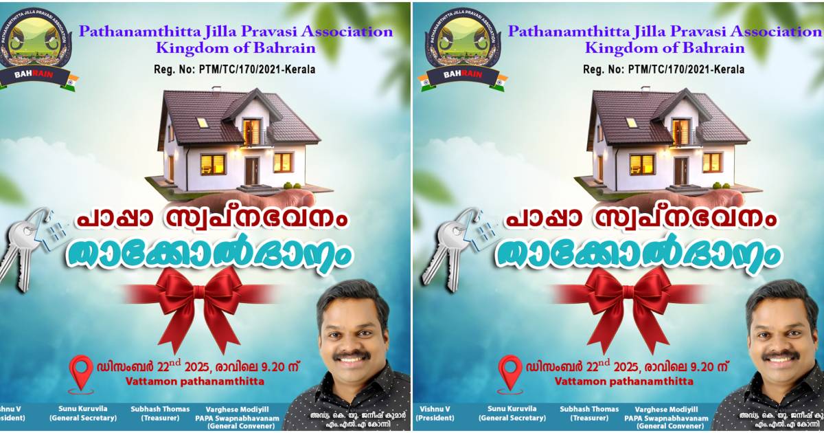 ബഹ്റൈനിലെ പ്രവാസികള്ക്കിടയില് സജീവമായ ജീവകാരുണ്യ പ്രവര്ത്തനങ്ങള് നടത്തുന്ന പത്തനംതിട്ട ജില്ലാ പ്രവാസി അസോസിയേഷന്റെ ഏറ്റവും ശ്രദ്ധേയമായ പദ്ധതികളിലൊന്നാണ് ‘പാപ്പാ സ്വപ്നഭവനം’. സ്വന്തമായി ഒരു വീടെന്ന സഹപ്രവര്ത്തകയുടെ സ്വപ്നം യാഥാര്ത്ഥ്യമാക്കാന് കഴിഞ്ഞതിന്റെ സന്തോഷത്തിലാണ് അസോസിയേഷന് പ്രവര്ത്തകര്.