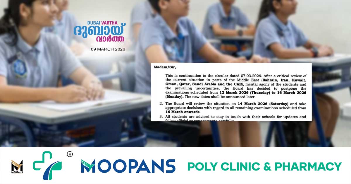 മിഡിൽ ഈസ്റ്റിലെ വിദ്യാർത്ഥികൾക്കുള്ള CBSE 12-ാം ക്ലാസ് പരീക്ഷകൾ മാറ്റിവച്ചു. – Dubai Vartha Skip to content error: Content is protected !! Related Post navigation ഇനി മുജ്തബ നയിക്കും, പുതിയ പരമോന്നത നേതാവിനെ തെരഞ്ഞെടുത്ത് ഇറാന് – ഇവാർത്തസുബിയ പവർ പ്ലാന്റിൽ തീപിടിത്തം; വൈദ്യുതി-ജല വിതരണം സാധാരണ നിലയിലെന്ന് മന്ത്രാലയം