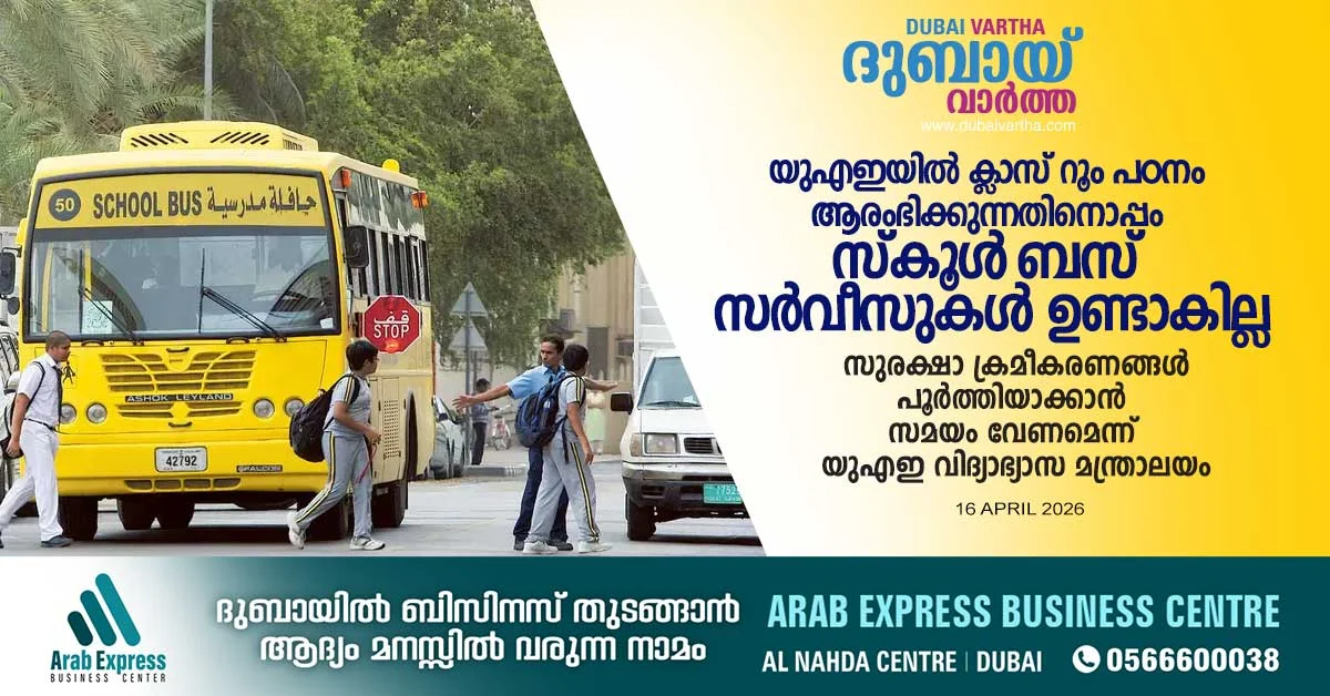 യുഎഇയിൽ ക്ലാസ് റൂം പഠനം ആരംഭിക്കുന്നതിനൊപ്പം സ്കൂൾ ബസ് സർവീസുകൾ ഉണ്ടാകില്ലെന്ന് വിദ്യാഭ്യാസ മന്ത്രാലയം – Dubai Vartha Skip to content error: Content is protected !! Related Post navigation വനിതാ സംവരണ ബില്ല് ഇന്ന് പാർലമെന്റിൽസലൂണുകളിലും ക്ലിനിക്കുകളിലും 10 ദിനാറിൽ കൂടുതലുള്ള ക്യാഷ് പെയ്മെന്റുകൾ നിരോധിച്ചു; ഉത്തരവിറക്കി കുവൈത്ത്