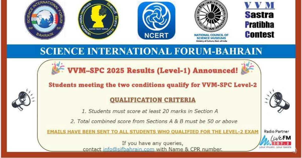 വിവിഎം-എസ്പിസി 2025 പ്രാഥമിക തല പരീക്ഷാഫലങ്ങള് പ്രഖ്യാപിച്ചു – Bahrain Vartha ബഹ്റൈൻ വാർത്ത Skip to content error: Content is protected !! Related Post navigation തൊഴില് നിയമ ലംഘനം: ഒരു മാസത്തിനുള്ളില് 300 ലധികം പേരെ ബഹ്റൈനില് നിന്ന് നാടുകടത്തി