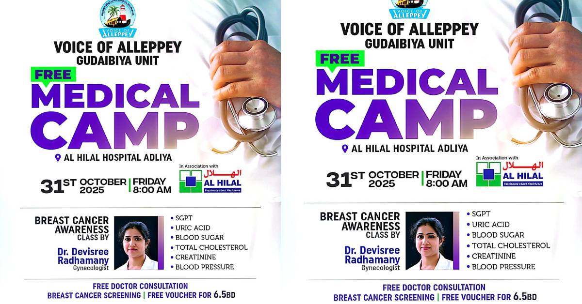 വോയ്സ് ഓഫ് ആലപ്പി സൗജന്യ മെഡിക്കല് ക്യാമ്പും സ്തനാര്ബുദ ബോധവല്ക്കരണ ക്ലാസും ഒക്ടോബര് 31ന് – Bahrain Vartha ബഹ്റൈൻ വാർത്ത Skip to content error: Content is protected !! Related Post navigation Indian envoy Kwatra discusses energy trade and ties with US deputy secretaryസർ ക്രീക്കിൽ ഇന്ത്യയുടെ ‘ത്രിശൂൽ’: വ്യോമാതിർത്തി അടച്ചുപൂട്ടി പാക്കിസ്ഥാൻ