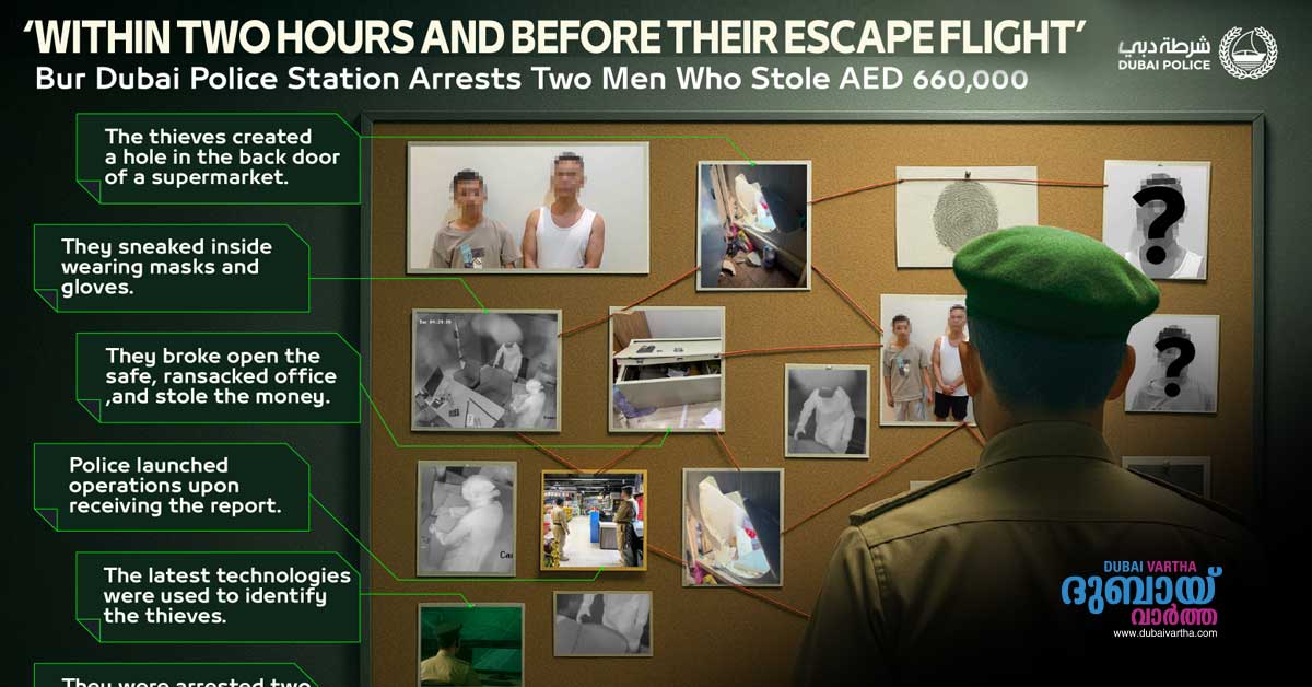 സൂപ്പർമാർക്കറ്റിൽ നിന്ന് 660,000 ദിർഹം മോഷ്ടിച്ച് രാജ്യം വിടാൻ ശ്രമിച്ച 2 പേരെ ദുബായ് വിമാനത്താവളത്തിൽ വെച്ച് പിടികൂടി ദുബായ് പോലീസ് – Dubai Vartha