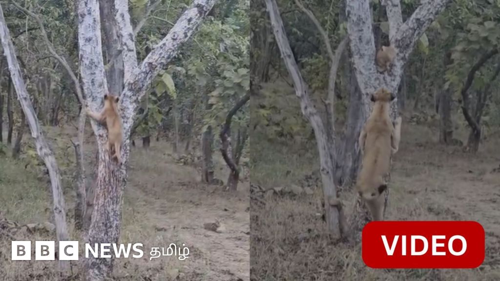 குஜராத்தில் சிங்கக் குட்டி ஒன்று மரத்தில் ஏறிய காட்சி இது. இதைப் பார்த்த தாய் சிங்கம் மரத்தின் அருகே செல்வதையும், மரத்தில் ஏற முயற்சிப்பதையும் பார்க்க முடிகிறது.