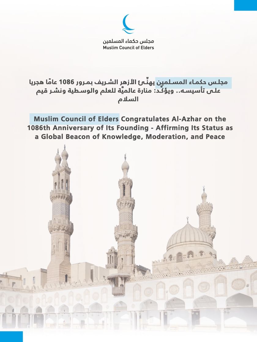 وهنأ مجلس حكماء المسلمين فضيلة الإمام الأكبر الأستاذ الدكتور أحمد الطيب، شيخ الأزهر الشريف، رئيس المجلس، وعلماء الأزهر الشريف وطلابه وخريجيه وجميع محبِّيه حول العالم؛ بمناسبة مرور 1086 عاما هجريا على تأسيسه.