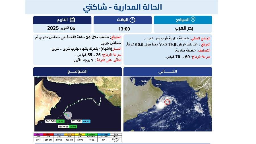 أكد المركز الوطني للأرصاد أن الحالة المدارية الحالية في بحر العرب عند خط عرض 19.6 شمالاً وخط طول 60.5 شرقاً، التي أطلق عليها اسم «شاكتي»، ليس لها أي تأثير في الإمارات. وأوضح المركز في آخر تحديثاته أن «شاكتي» تصنف حاليا كعاصفة مدارية تتمركز في غرب بحر العرب، مصحوبة برياح تتراوح سرعتها بين 60 و70 كيلومتراً في الساعة. وتوقع المركز أن تشهد الحالة المدارية تراجعا في قوتها خلال الساعات الـ 24 القادمة، لتتحول تدريجياً إلى منخفض مداري، ومن ثم إلى منخفض جوي، مع استمرار تحركها باتجاه جنوب شرق – شرق بسرعة تتراوح بين 25 و55 كيلومتراً في الساعة.