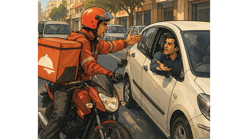 وقال إنه كان في طريقه ذات مرة للخروج من شارع خدمات إلى طريق رئيس، وانتظر الفرصة للتأكد من خلو الطريق قبل الدخول إليه، وفي هذه الأثناء خرجت من جانبه دراجة توصيل لم يرَها وتحركت معه في الوقت ذاته، فصدمها وأوقعها أرضاً، وصدم بسلوك سائقها الذي حاول تحميله الخطأ وتحدث إليه بأسلوب غير لائق.